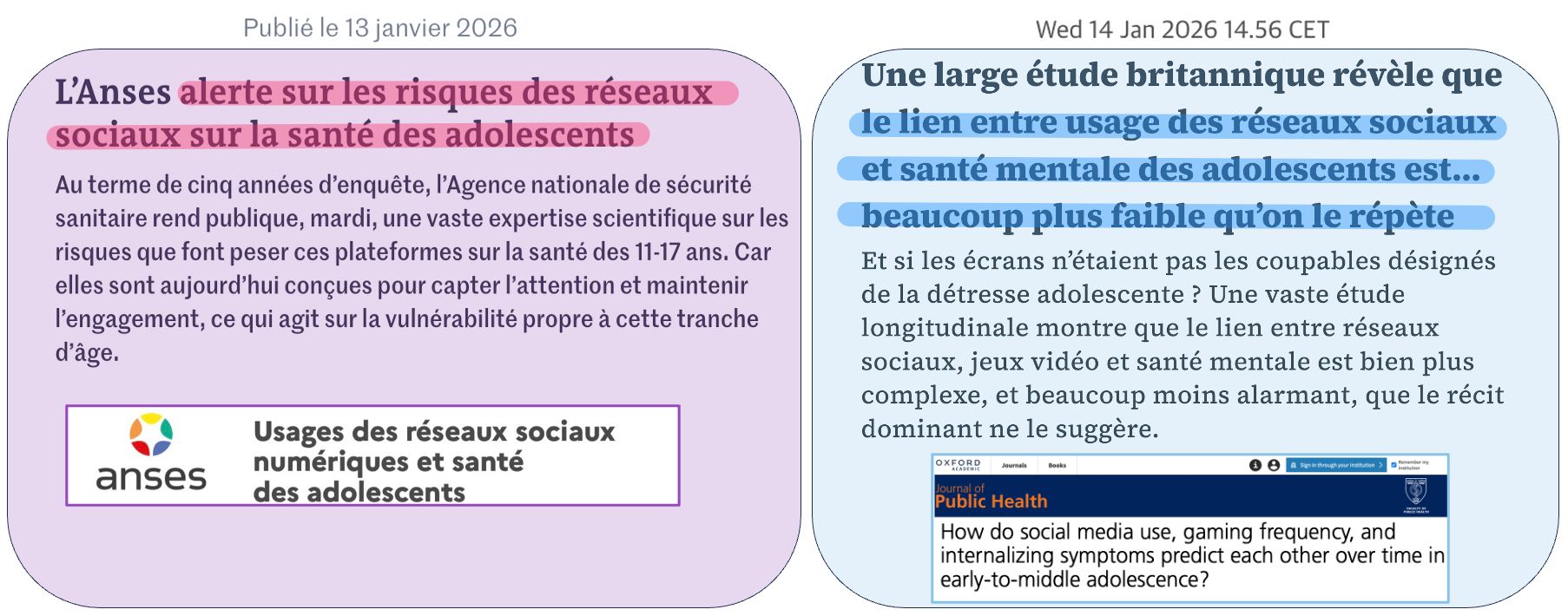 L'Anses (France) alerte sur des risques majeurs d'anxiété, dépression et troubles du sommeil chez les 11-17 ans, blâmant les algorithmes addictifs. À l'opposé, une recherche britannique (Université de Manchester) minimise le lien, affirmant un impact faible sans causalité prouvée, et accusant une hype médiatique exagérée.