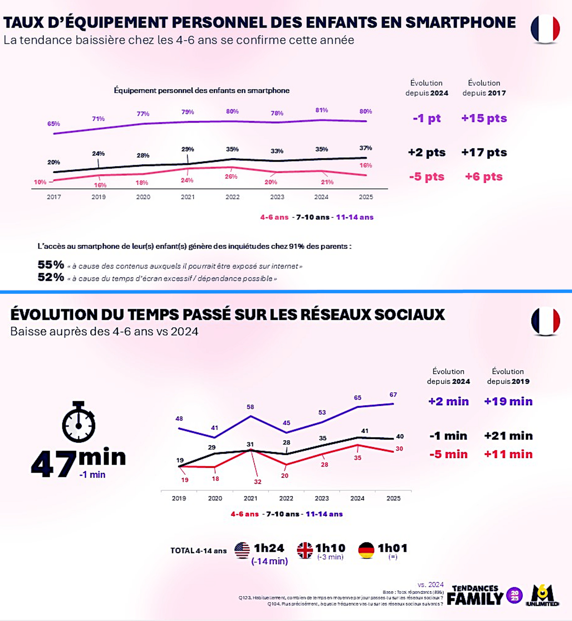 En 2025, 80 % des 11-14 ans et 37 % des 7-10 ans possèdent un smartphone en France, contre seulement 16 % des 4-6 ans.