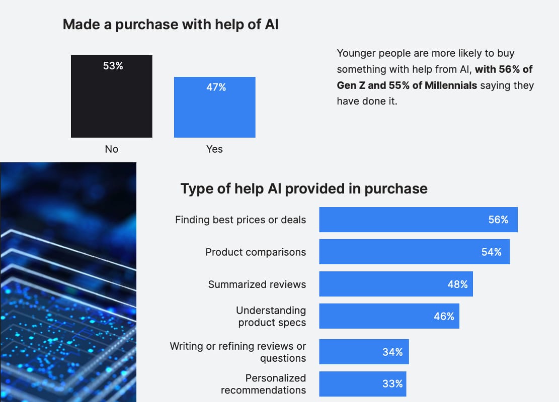 47 % des consommateurs américains ont déjà utilisé l’IA pour effectuer un achat, une pratique plus marquée chez les jeunes : 56 % de la Génération Z et 55 % des Millennials déclarent l’avoir fait.