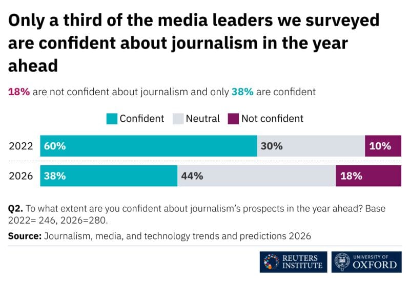 La confiance dans le journalisme s’effondre en 2026 : seulement 38 % des dirigeants médias se déclarent optimistes, contre 60 % en 2022. Cette chute s’explique par l’impact de l’IA sur le trafic, la concurrence des créateurs de contenu et la domination des formats vidéo. Malgré quelques succès en matière d’abonnements, le secteur reste sous pression, avec une défiance croissante, notamment chez les jeunes.