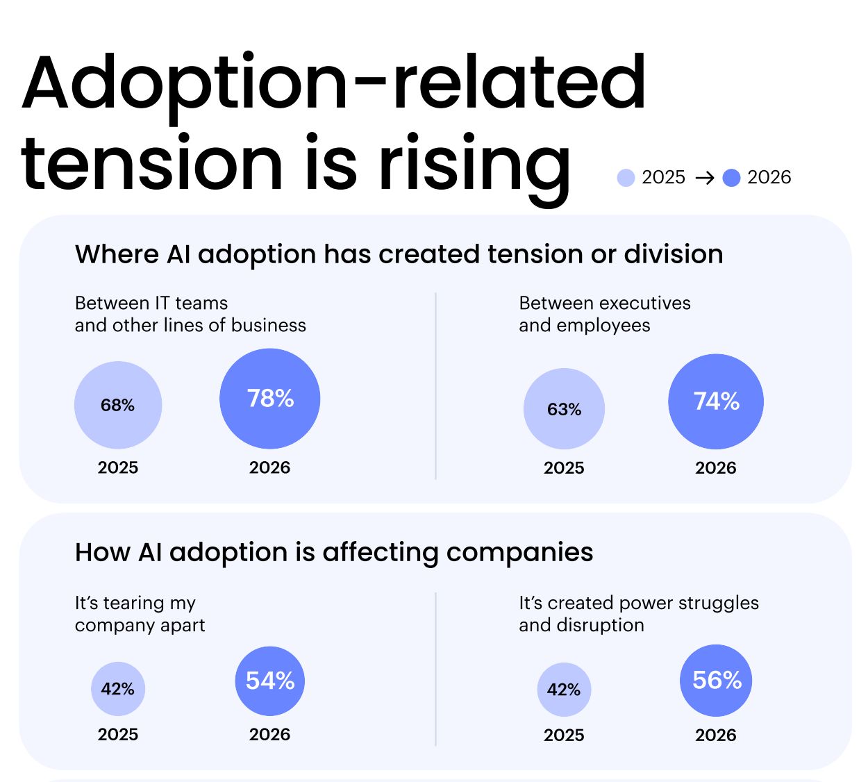 L’étude montre également que l’adoption de l’IA en entreprise aggrave les divisions internes. Entre 2025 et 2026, les tensions ont augmenté entre les équipes IT et les autres métiers (de 68 % à 78 %), ainsi qu’entre dirigeants et employés (de 63 % à 74 %). Parallèlement, 54 % des répondants estiment que l’IA fragmente leur organisation, et 56 % qu’elle crée des luttes de pouvoir et des perturbations.