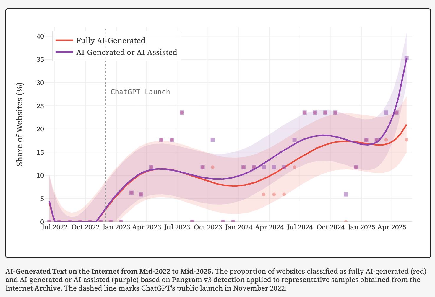 Une étude récente (Imperial College London, Stanford, Internet Archive) révèle que 35 % des nouveaux sites web (2022-2025) sont générés ou assistés par l’IA, et que ces contenus rendent le web « artificiellement heureux ».