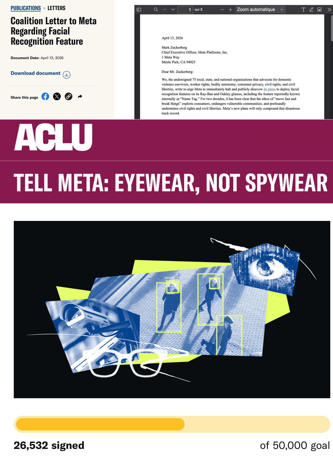 Plus de 70 organisations américaines alertent sur les lunettes de Meta capables de scanner les visages en temps réel pour révéler l'identité de parfaits inconnus. Cette technologie supprimerait l’anonymat public et donnerait aux harceleurs et aux agents fédéraux un outil discret et puissant.
