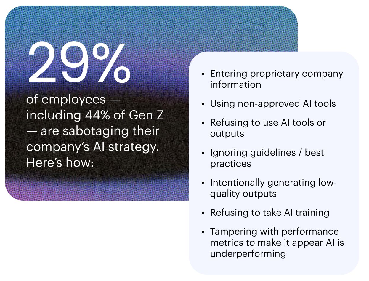 Un rapport de Writer et Workplace Intelligence révèle que 29 % des employés en Europe et aux États-Unis sabotent la stratégie IA de leur entreprise. Les méthodes vont de l’évitement des outils à l’injection de données sensibles dans des IA non sécurisées, voire à la falsification de métriques pour discréditer la technologie. Les jeunes (Gen Z) sont les plus rebelles (44 %), craignant pour leur emploi dans un marché du travail instable.