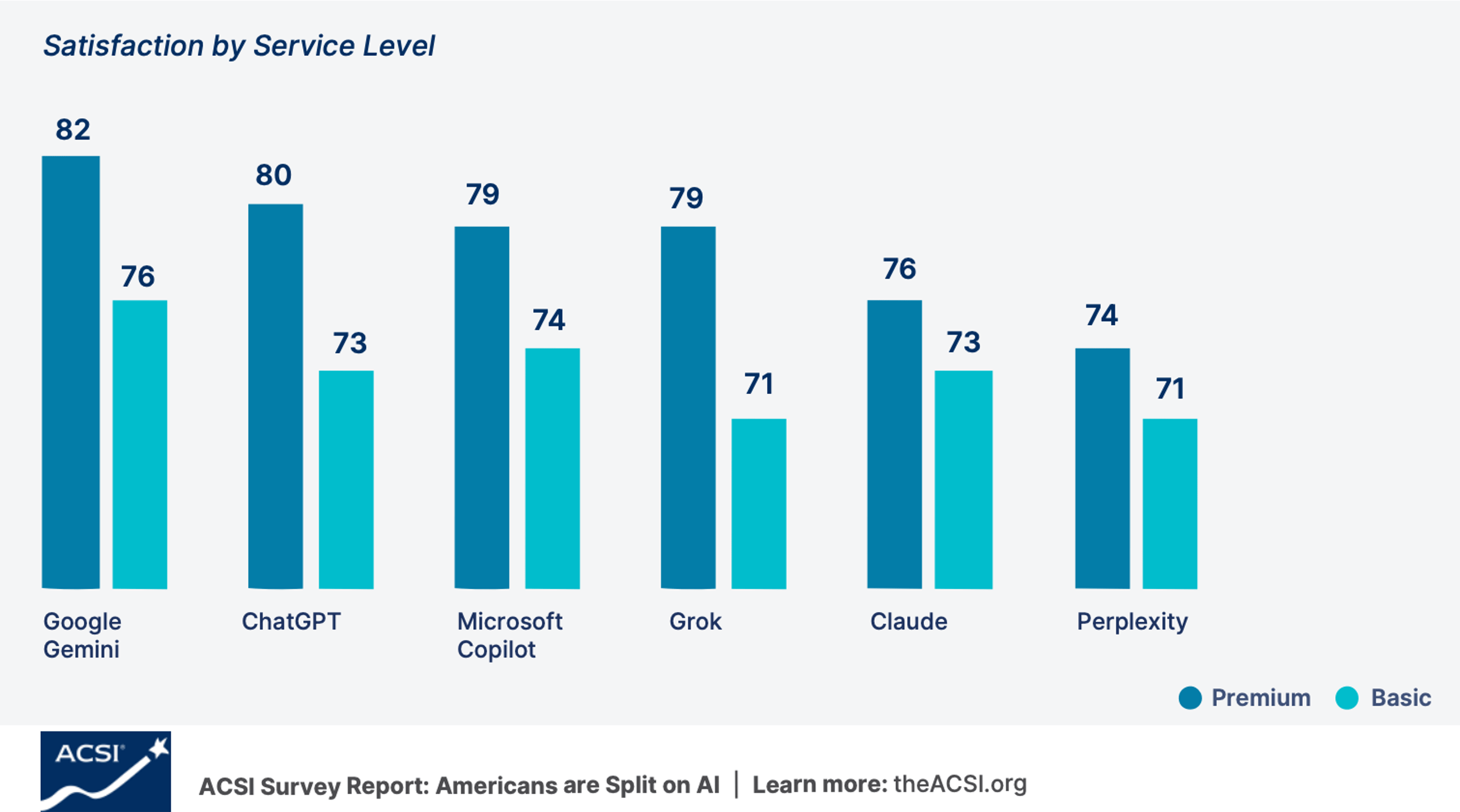 Le baromètre ACSI confirme la domination de Google Gemini qui s'impose en tête du marché américain avec un score de satisfaction culminant à 82/100, loin devant Grok qui peine à 71/100 en version gratuite.