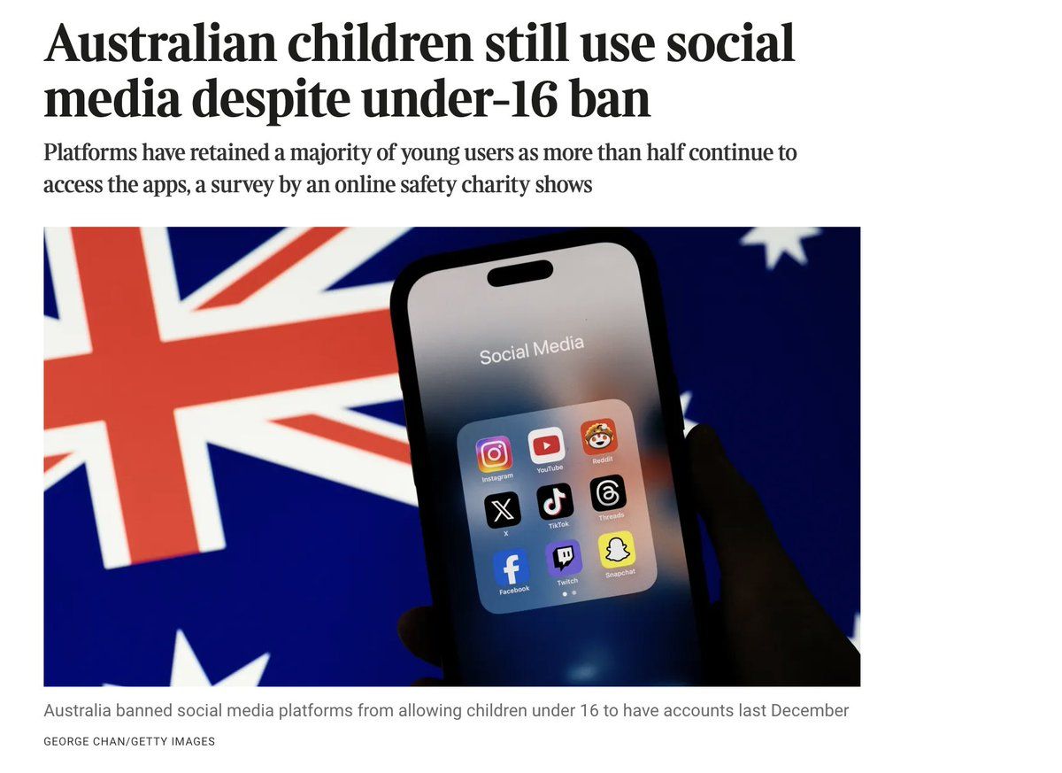 La Molly Rose Foundation a interrogé 1 050 jeunes Australiens de 12-15 ans après l’interdiction des réseaux sociaux pour les moins de 16 ans. 61% des enfants qui avaient un compte avant le ban y accèdent encore. TikTok et YouTube gardent 53% de leurs utilisateurs mineurs, Instagram 52%. Dans 60% des cas, les plateformes n’ont pris « aucune mesure » pour fermer ces comptes.
