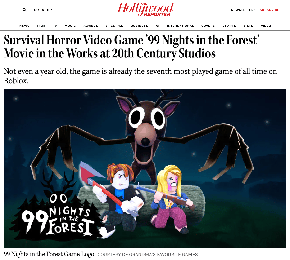 Des jeux viraux comme Grow A Garden, Steal a Brainrot, Jailbreak, et désormais 99 Nights in the Forest chez 20th Century sont en développement.