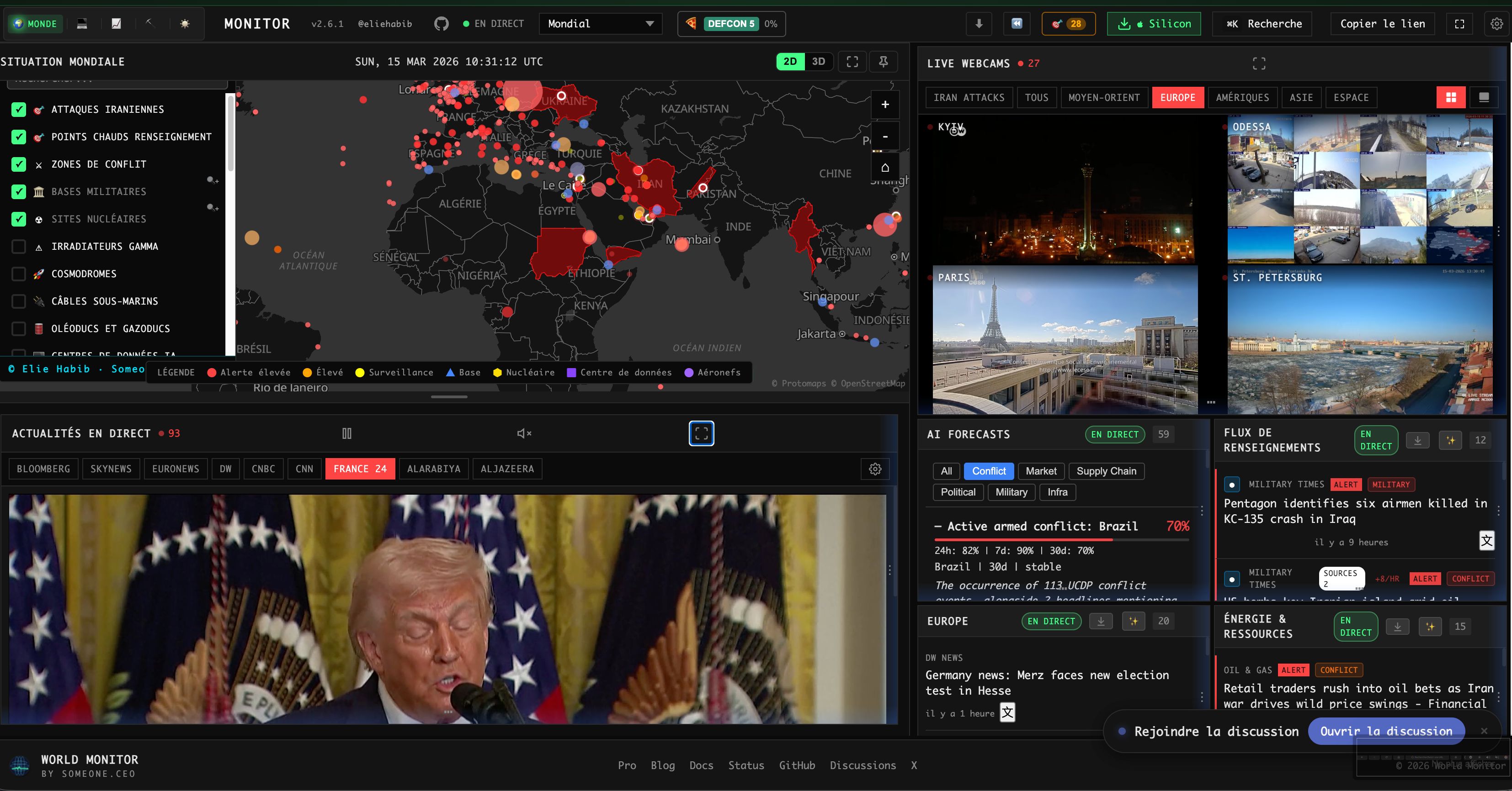 World Monitor est un site qui agrège données géopolitiques, militaires, financières et environnementales en une seule plateforme visuelle et interactive, en temps réel (flux de webcams, cartes d'alertes mondiales, câbles sous-marins, marchés financiers, instabilité géopolitique en temps réel).