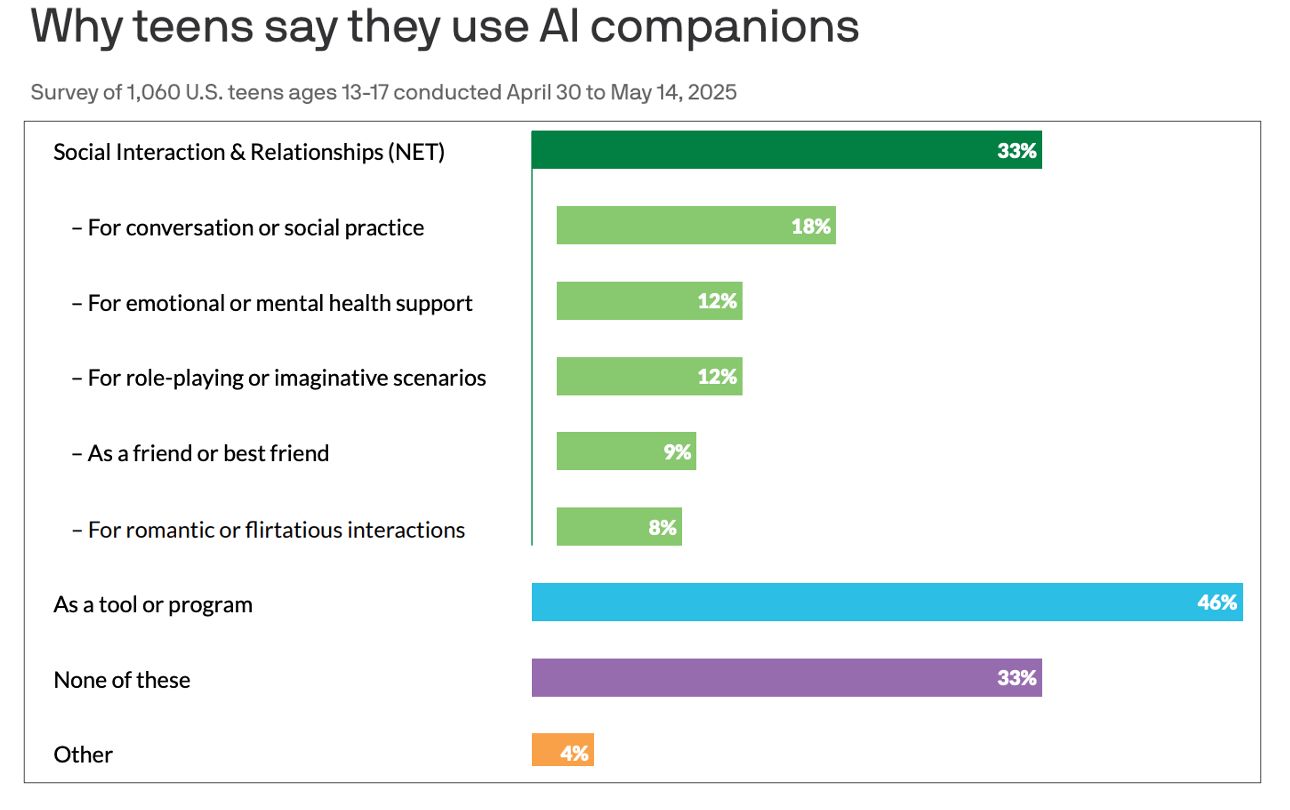 Bastien n'est pas un cas isolé. Aux États-Unis, 33 % des 13-17 ans se tournent vers l'IA pour du soutien émotionnel ou des conseils sans jugement ni moquerie, dispo 24/7. Et surtout : sans friction. L'outil est programmé pour plaire, valider, ne jamais heurter.