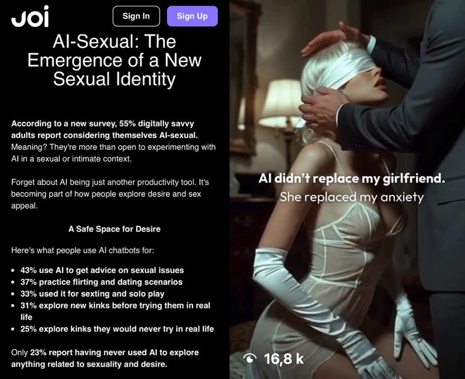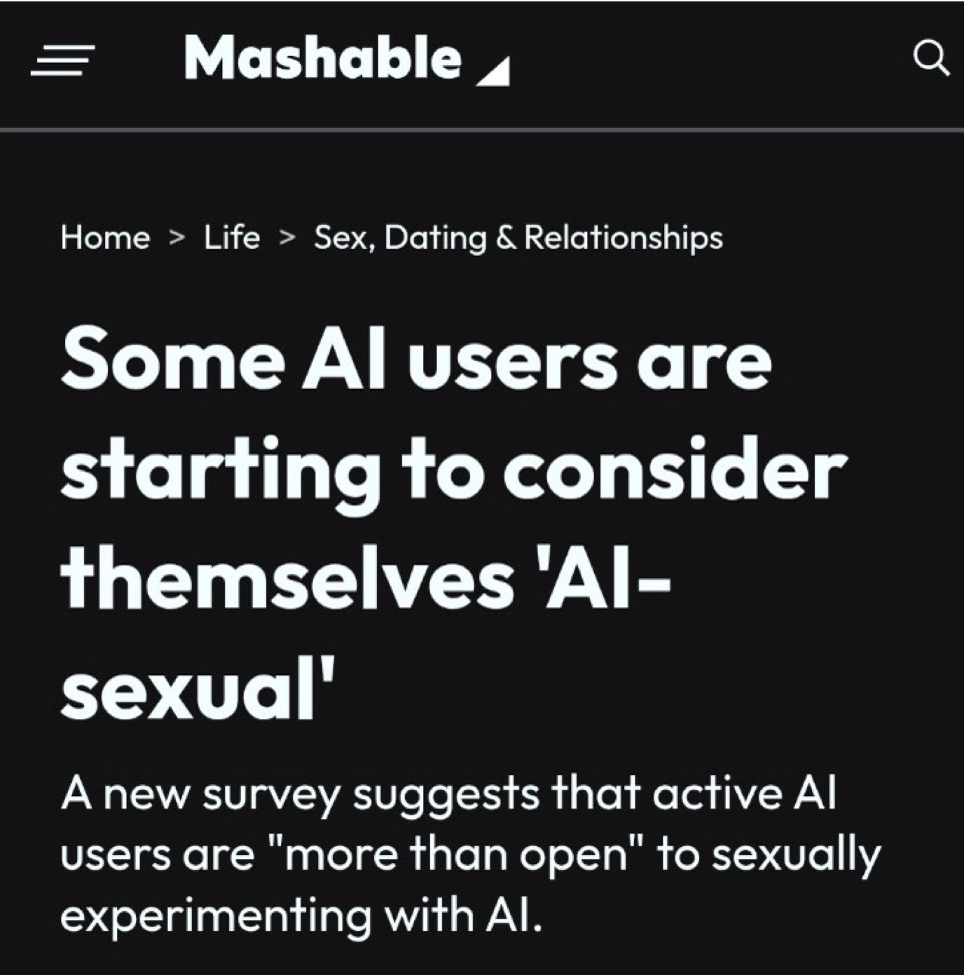 « AI-sexual » emprunte la grammaire des orientations sexuelles comme bisexuel ou pansexuel. En accolant le préfixe AI- à ce champ lexical, l’intimité artificielle est présentée comme une nouvelle catégorie légitime, avec sa propre identité revendiquée, une nouvelle fluidité identitaire en quelque sorte.
