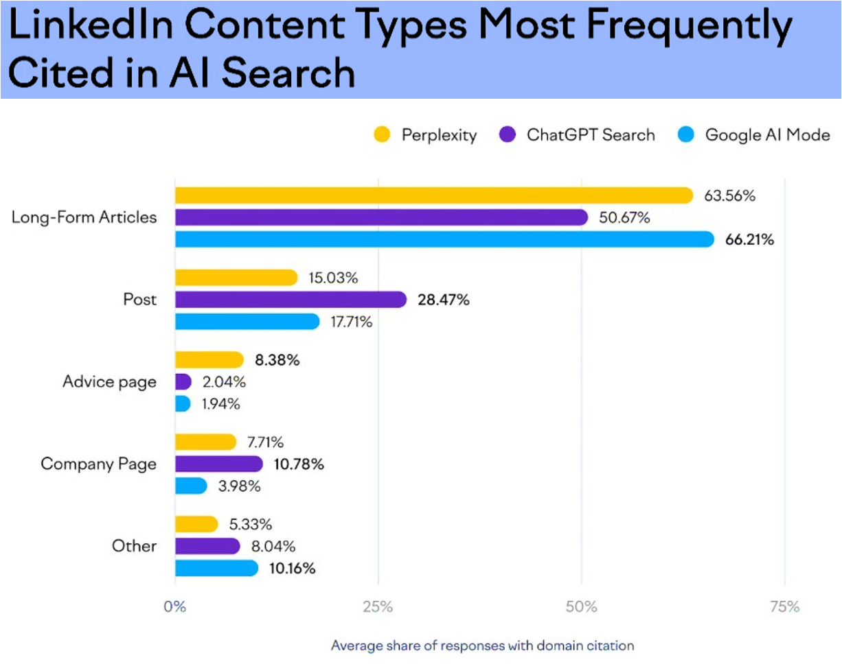 Selon une autre étude par Semrush qui vient d'analyser 89 000 URLs LinkedIn, les IA ne citent pas LinkedIn au hasard. Elles ont une préférence claire : les articles longs. Entre 50 et 66 % des citations selon la plateforme. Loin devant les posts, les pages entreprises, ou les conseils.