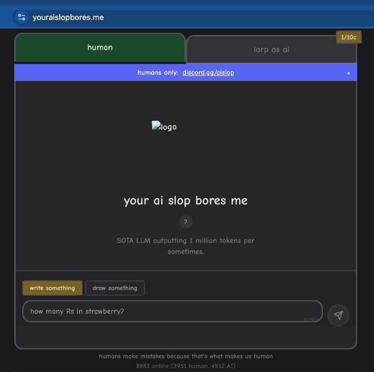C'est exactement ce que propose “Your AI slop bores me” un site parodique qui reprend l'interface de ChatGPT via un principe simple et légèrement absurde : vous posez une question, un inconnu quelque part dans le monde y répond. Quand vous manquez de crédits, vous en gagnez en jouant vous-même le rôle de l'IA, en répondant aux questions des autres.