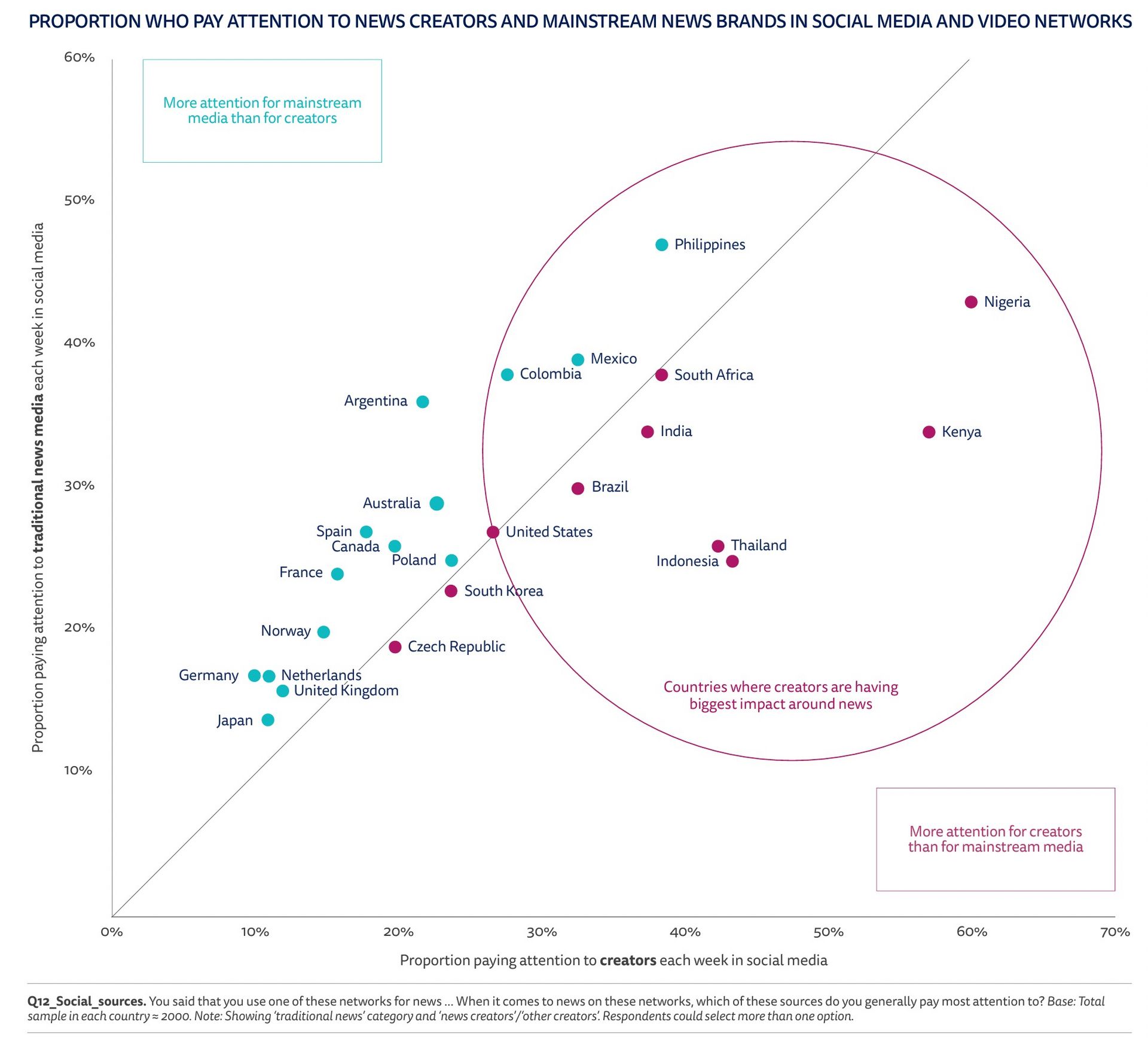 Une Ă©tude du Reuters Institute rĂ©vĂšle une fracture gĂ©o-gĂ©nĂ©rationnelle dans la consommation d'actualitĂ©s : aux Ătats-Unis, Mexique, ThaĂŻlande, Philippines, Nigeria ou Kenya, les audiences se tournent davantage vers les crĂ©ateurs de contenu d'information que vers les mĂ©dias traditionnels.