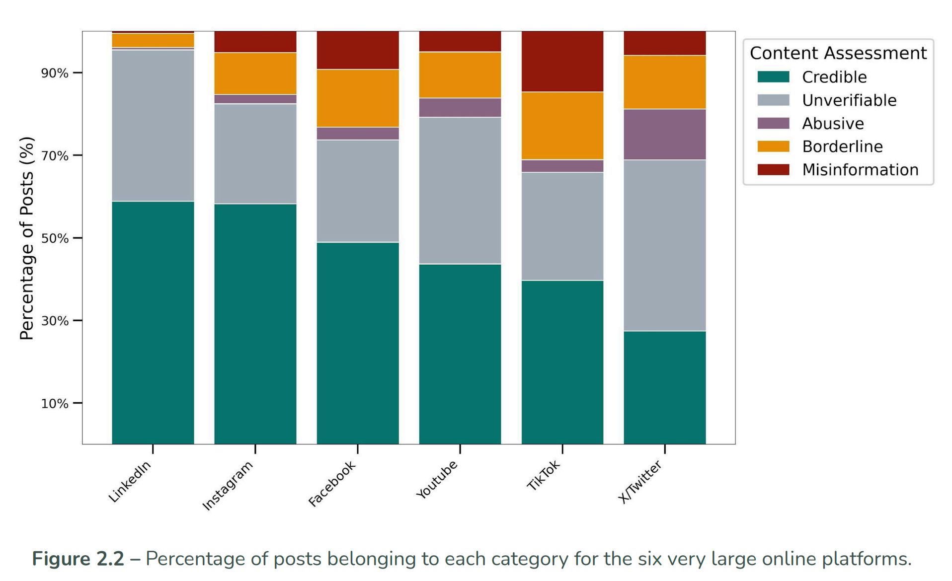 TikTok, champion de la viralitĂ©, affiche jusquâĂ 20 % de contenus trompeurs, tandis que Facebook, X ou YouTube ne sont pas en reste, avec des proportions oscillant entre 8 et 13 %.