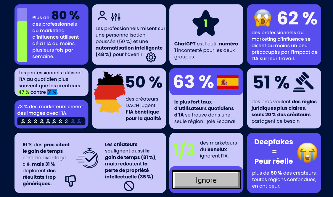 75 % des pros du marketing d’influence et créateurs utilisent l’IA plusieurs fois par semaine pour rédiger, planifier ou analyser, avec un gain de temps salué par 91 % d’entre eux.