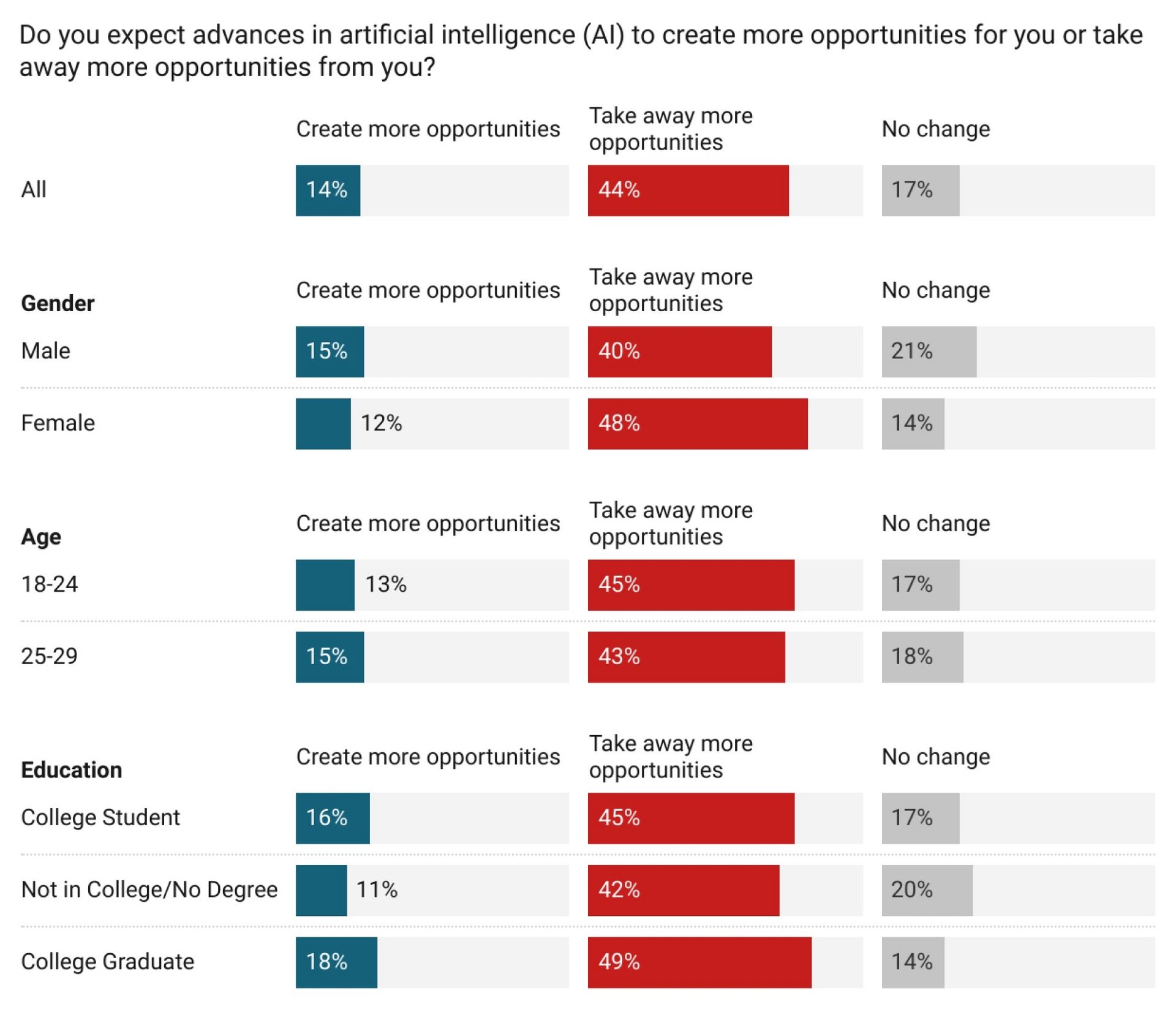 Selon le sondage Harvard Youth Poll, 58 % des 18-29 ans estiment que lâintelligence artificielle menace leur emploi ou leur carriĂšre. Une inquiĂ©tude particuliĂšrement marquĂ©e chez les jeunes diplĂŽmĂ©s et les travailleurs prĂ©caires, qui redoutent dâĂȘtre remplacĂ©s par des outils automatisĂ©s. Pourtant, 42% y voient aussi une opportunitĂ© (formations accĂ©lĂ©rĂ©es, nouveaux mĂ©tiers). Le clivage rĂ©vĂšle une gĂ©nĂ©ration partagĂ©e entre peur et adaptation, alors que lâIA redessine le marchĂ© du travail.
