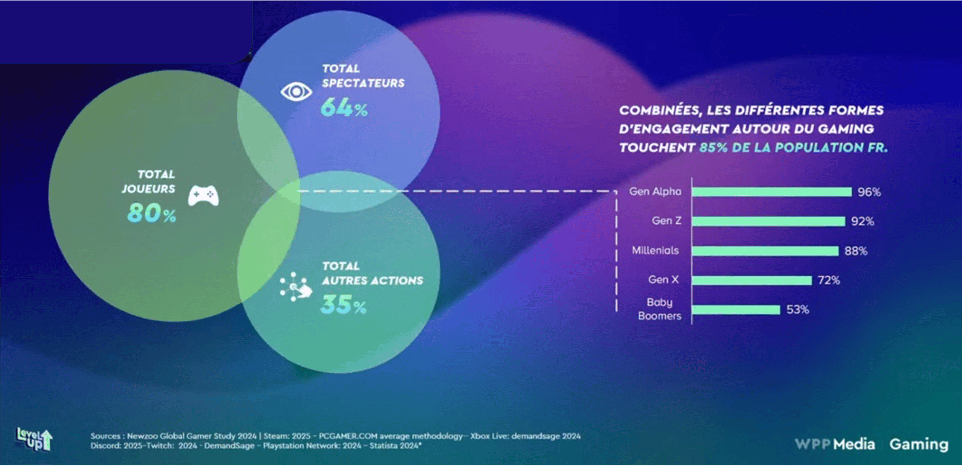 De son cĂŽtĂ© WPPMedia Gaming, lors dâune confĂ©rence la semaine derniĂšre, rĂ©vĂšle Ă©galement l'extraordinaire portĂ©e du jeu vidĂ©o en France, et confirme sa place de mĂ©dia de masse incontournable. L'Ă©cosystĂšme du gaming touche dĂ©sormais 85% de la population, affichant une pĂ©nĂ©tration dĂ©mographique massive et intergĂ©nĂ©rationnelle.