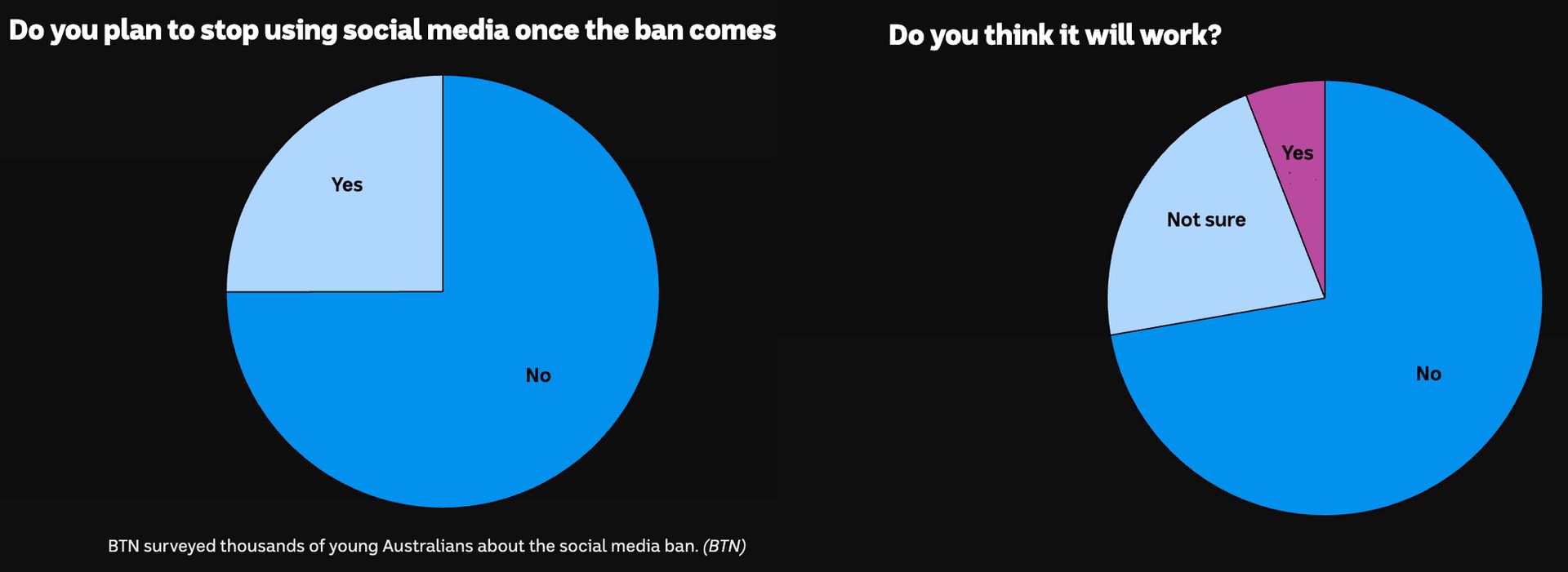 Un sondage publiĂ© le 2 dĂ©cembre dernier, menĂ© auprĂšs de 17 000 jeunes australiens, rĂ©vĂšle leur position : 72 % jugent la loi inefficace et 75 % dĂ©clarent qu'ils continueront quand mĂȘme Ă utiliser les plateformes. Tout est dit. đ„