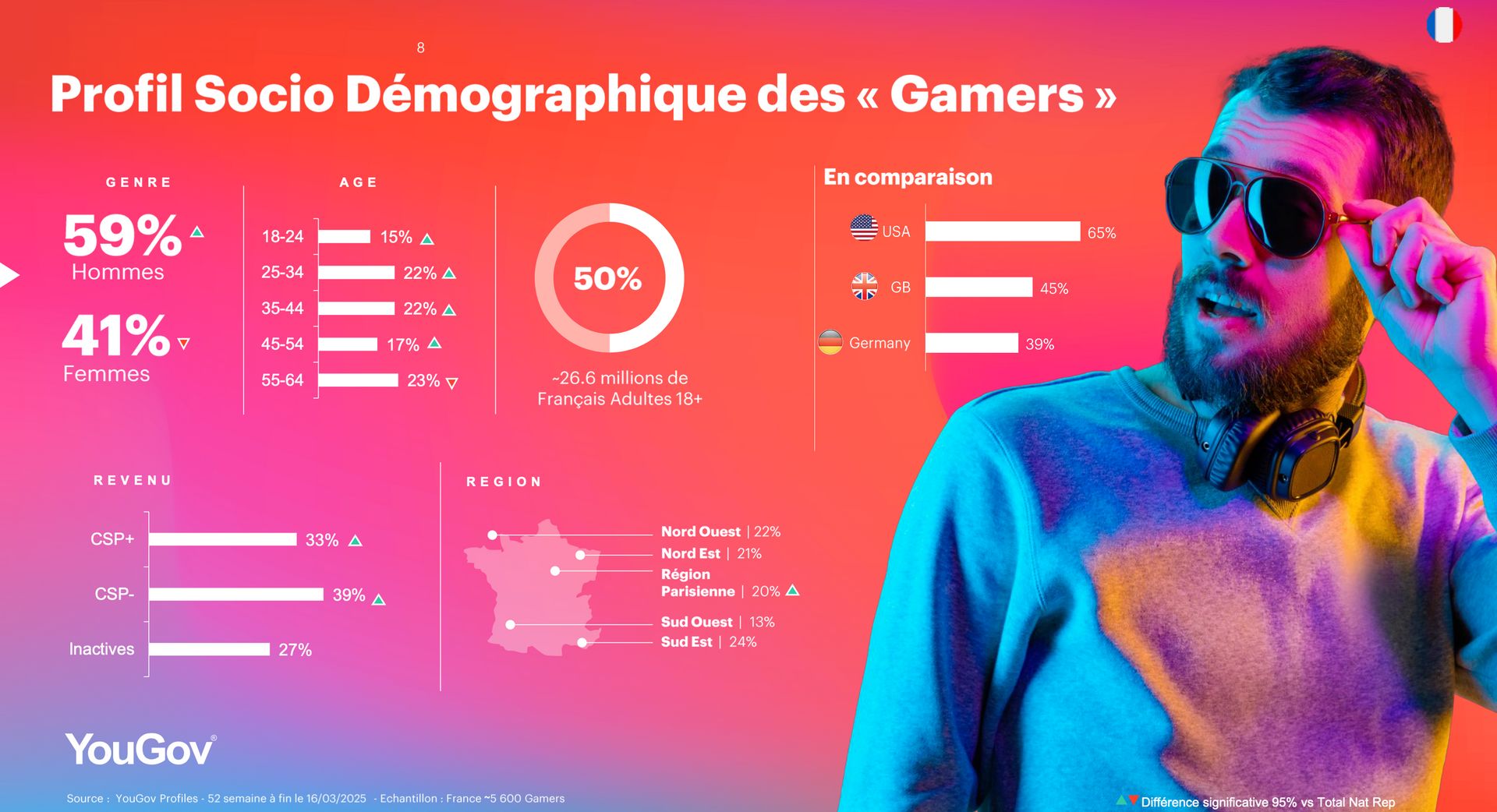 Ce tout rĂ©cent rapport YouGov confirme que le jeu vidĂ©o nâest plus un loisir marginal, mais un phĂ©nomĂšne de masse : 1 Français sur 2 se dĂ©clare joueur. Le jeu vidĂ©o est devenu un loisir de masse, et les joueurs se distinguent surtout par leur prĂ©sence en ligne soutenue.