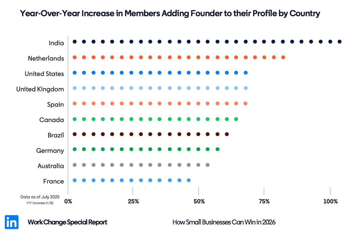 Le nombre de membres LinkedIn ajoutant le titre de "fondateur" a augmenté de 60% en un an, et a triplé depuis juillet 2022. Cette tendance est particuliÚrement marquée en Inde avec une augmentation spectaculaire de 104 % d'une année sur l'autre.