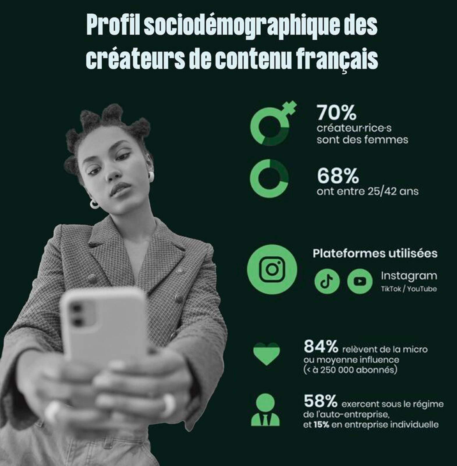 Les créateurs sont majoritairement de micro ou moyenne influence (84% ont moins de 250 000 abonnés) et subissent des fragilités : manque de transparence des algorithmes (53%), pression des statistiques et revenus instables (43%).