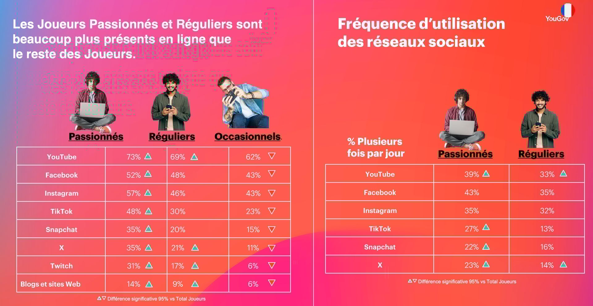 Les PassionnĂ©s (7%) et les RĂ©guliers (30%) sont hyper-connectĂ©s, et affichent une utilisation quotidienne et intensive des plateformes comme YouTube, Twitch et les rĂ©seaux sociaux. Cette frĂ©quence Ă©levĂ©e nourrit leur culture gaming et leurs interactions sociales : tutoriels, streams, mĂ©mes, ou discussions autour de leurs passions (films, sĂ©ries, lifestyle). « Ils ne consomment pas seulement des jeux, ils vivent en ligne », une aubaine pour les annonceurs⊠đ€