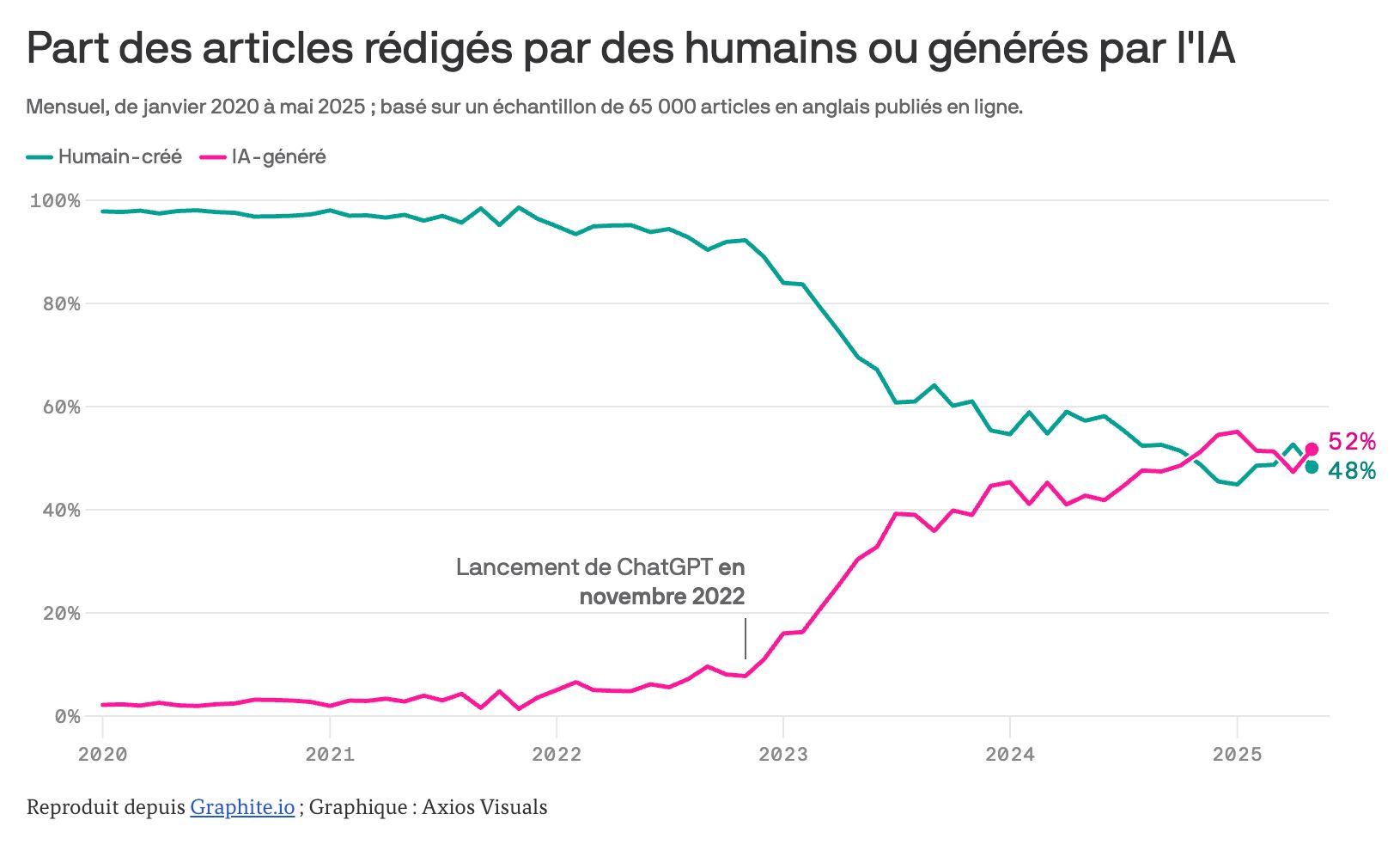 Depuis novembre 2024, la proportion s'est stabilisĂ©e autour de 50-50 entre contenu IA et humain. En mai 2025, 52% des nouveaux articles Ă©taient gĂ©nĂ©rĂ©s par IA, suggĂ©rant que cette tendance a atteint un plateau.đ€