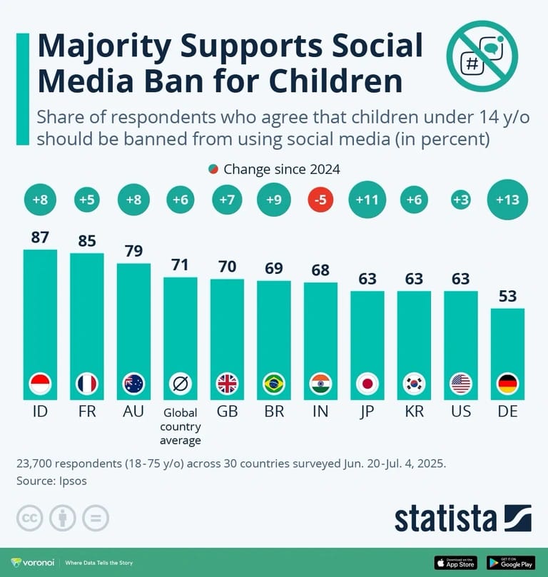Ă la question « Seriez-vous dâaccord pour interdire les rĂ©seaux sociaux aux moins de 14 ans ? », 71 % des rĂ©pondants dans 30 pays disent oui et jusquâĂ 85 % en France, deuxiĂšme pays le plus strict aprĂšs lâIndonĂ©sie (87 %).