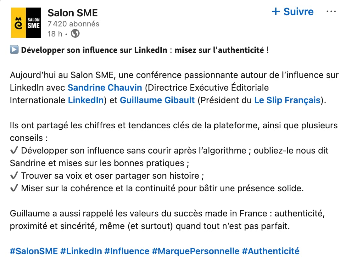 Tel est le conseil commun de Sandrine Chauvin (LinkedIn France) et Guillaume Gibault (Le Slip Français) au Salon SME la semaine derniĂšre : âOubliez lâalgo, parlez vrai, trouvez votre voix, bĂątissez une prĂ©sence cohĂ©rente⊠en trois mots : authenticitĂ©, proximitĂ©, sincĂ©ritĂ©.â