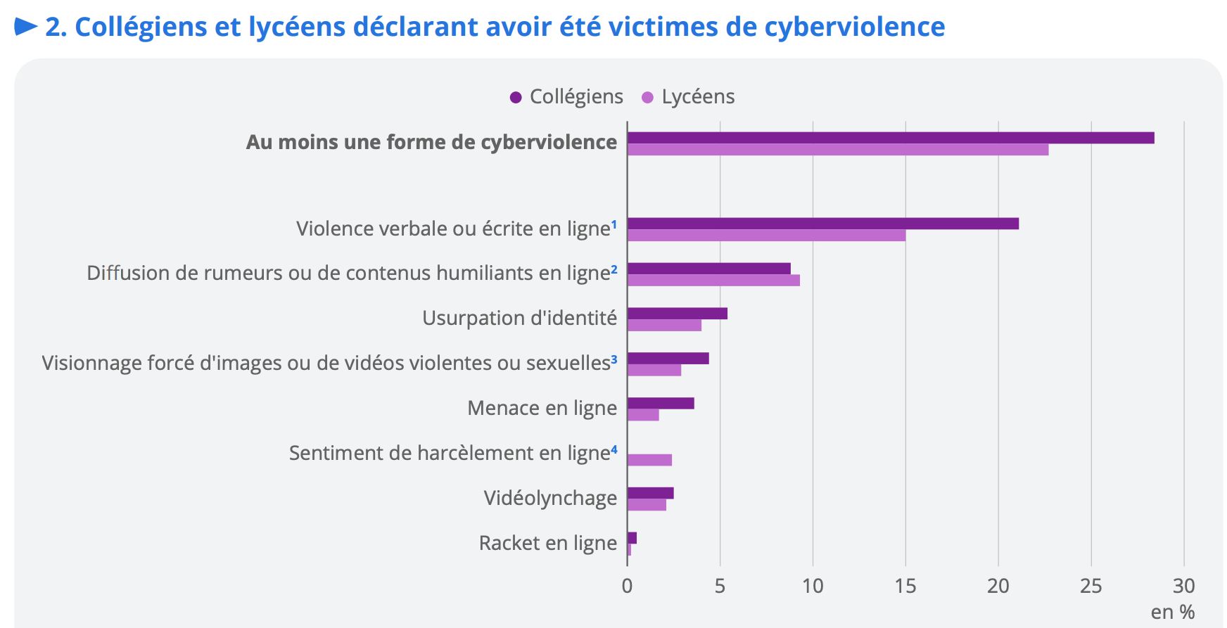 PrÚs de trois collégiens sur dix (28 %) déclarent avoir subi au moins une forme de cyberviolence en lien avec leur cadre scolaire, un chiffre qui monte à 31 % pour les collégiennes contre 26 % pour les collégiens.